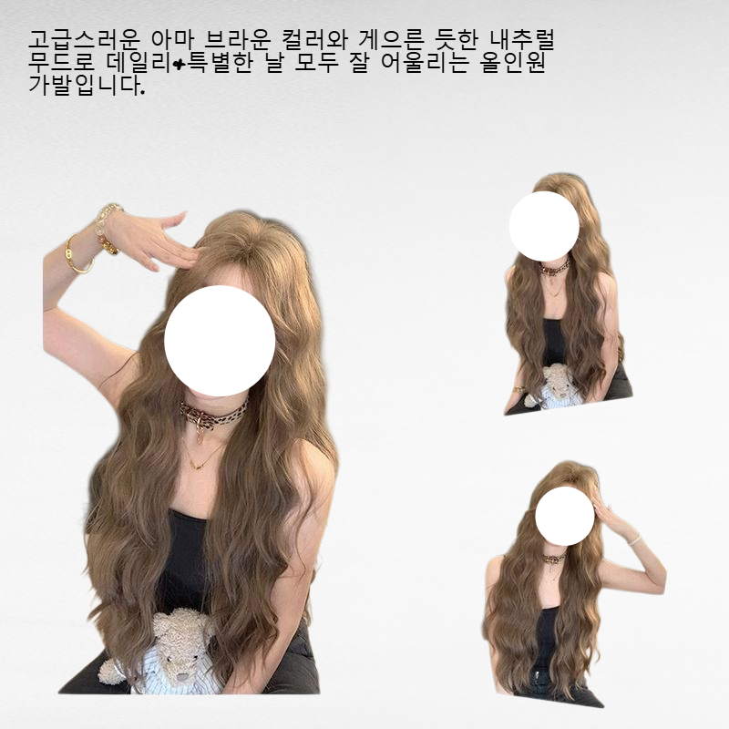 ● 자연스러운 중분 아웃라인과 부드러운 웨이브로 얼굴형을 예쁘게 보완해주는 트렌디한 롱 웨이브 스타일입니다. ● 고급스러운 아마 브라운 컬러와 게으른 듯한 내추럴 무드로 데일리&특별한 날 모두 잘 어울리는 올인원 가발입니다. ● 통기성이 뛰어난 전체두피망을 사용하여 장시간 착용해도 답답함 없이 편안하게 스타일을 완성할 수 있습니다. ● 손쉬운 착용과 관리로 바쁜 아침에도 빠르게 스타일링이 가능하며, 내추럴한 볼륨감으로 헤어 고민을 해결해줍니다. ● 고급 인모 느낌의 소재로 자연스러운 윤기와 터치감을 자랑하며, 다양한 패션과 매치하기 좋은 활용도 높은 아이템입니다.